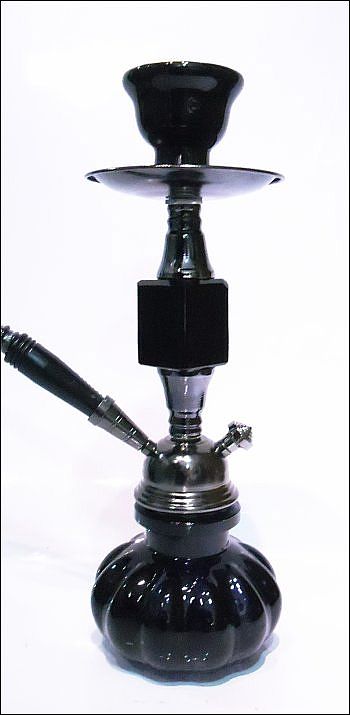 Narguile / Arguile compacto, marca MUNDIAL, modelo especial SIMPLES. Tubo e corpo em tom preto cromado, decorado com uma imitação de cristal lapidado, altura montada de 30cm, vaso em vidro preto e moldado.